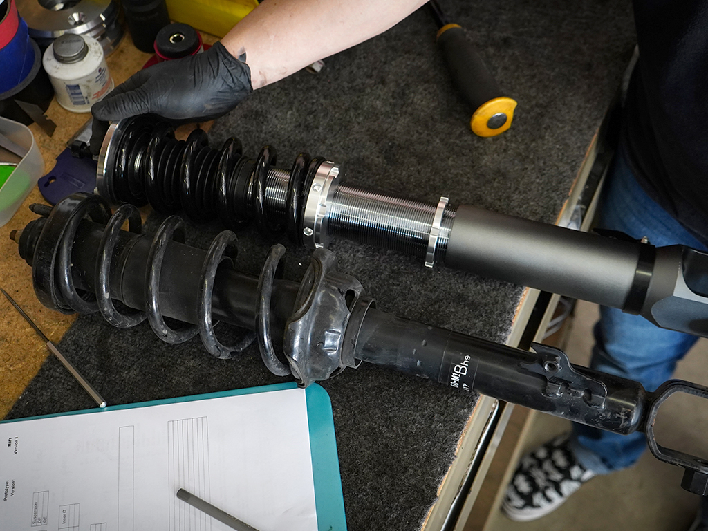 Remove both two top mount nuts with a 14mm socket and remove OEM Suspension.